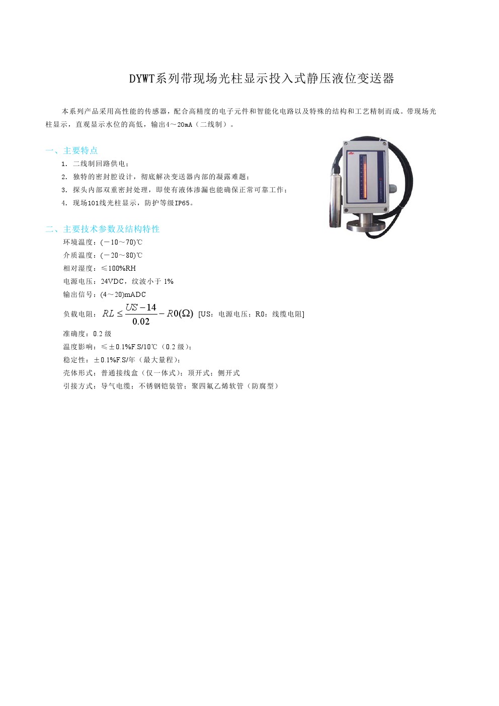 DYWT系列帶現(xiàn)場(chǎng)光柱顯示投入式靜壓液位變送器